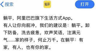 在App Store的内容介绍里,写着这样的一段话:“躺平,阿里巴巴旗下生活方式App。有人让你向前冲,我们的建议是:躺平。卸下防备,洗去疲惫,欢声笑语,注满元气……家的样子,何止万千。在躺平:有家,有人,也有你的家。”