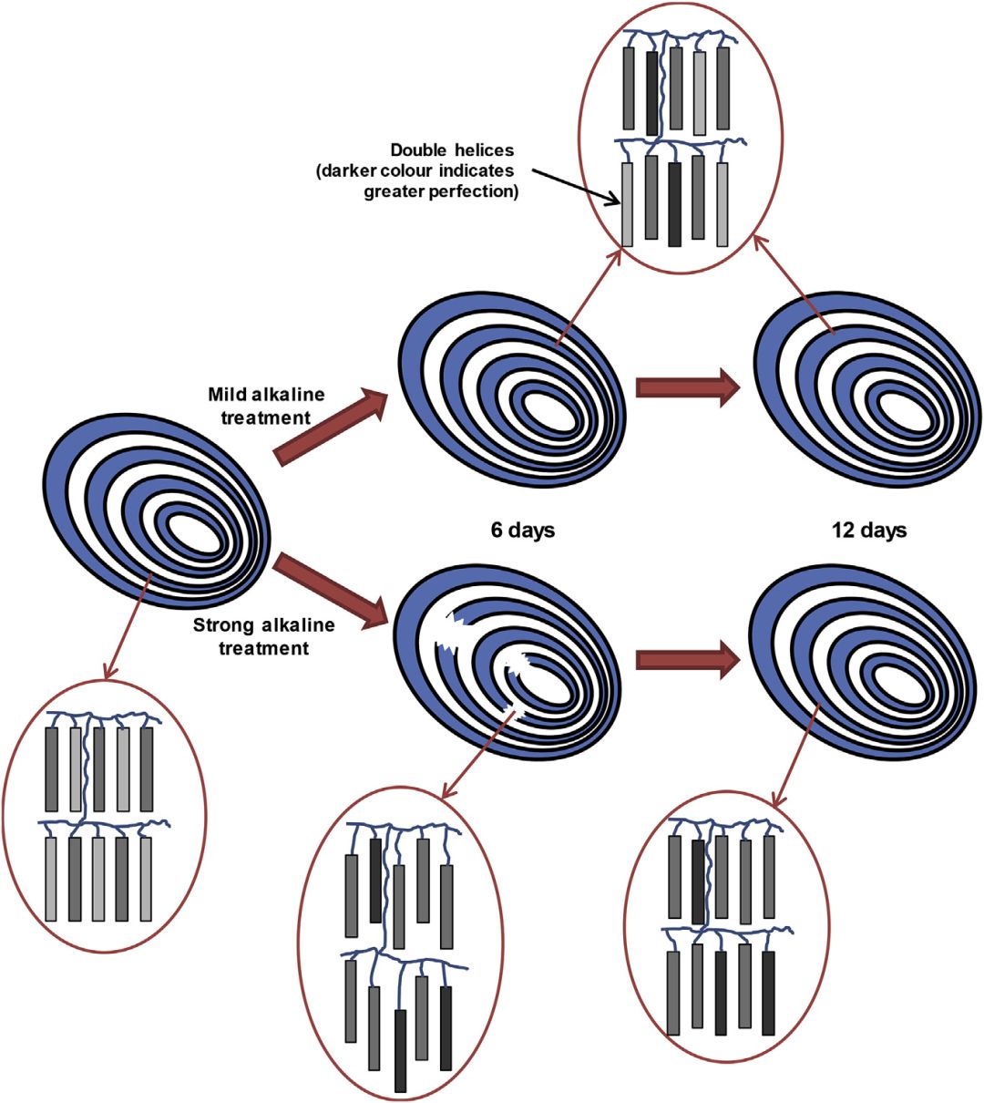 天然蜡质玉米淀粉主要成分为支链淀粉,呈A-型晶体结构。本研究表明:氢氧化钠处理后(0.1%或0.5%)主要影响了支链淀粉双螺旋结构,但其片层和超分子结构依然存在。虽然支链淀粉片层有序性在0.5%的碱处理6天后有所降低,但第6~12天的碱处理恢复了支链淀粉片晶的有序性。在碱处理中,尽管淀粉双螺旋的有序结构和结晶发生了改变,但其更大尺寸的结构(如:小体结构和生长环)受影响较小。