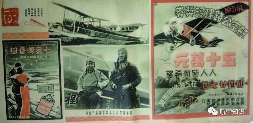涂有“鹏程万里”字样的“月辉”号飞机。孙桐岗(右)与同学王祖文机前合影。以及民国航空公路建设奖券的广告。