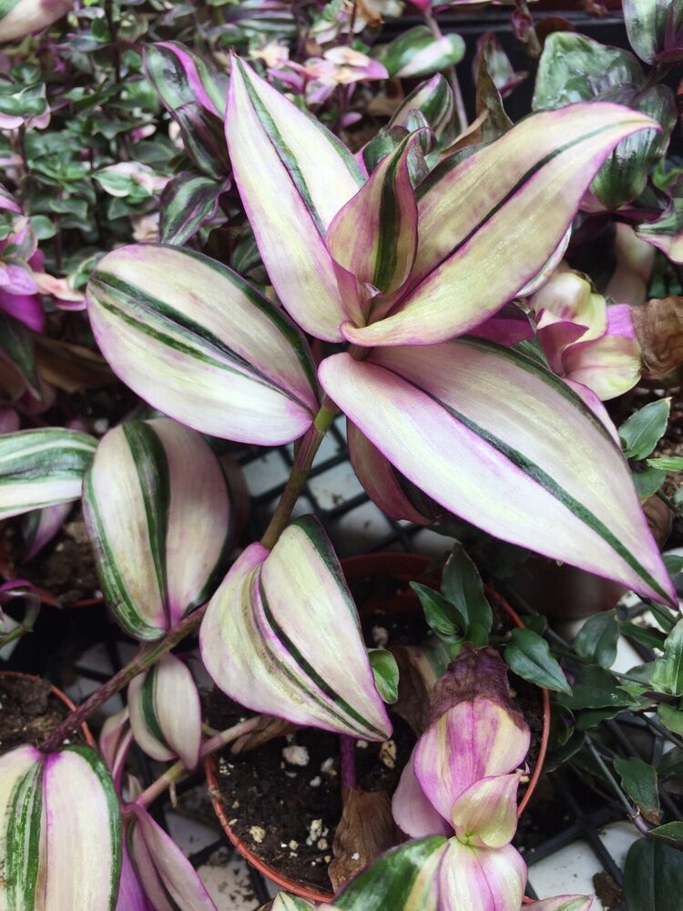 吊竹梅的品种非常丰富,除了有常见的紫色、绿色和白色相间斑纹的品种,还有其他粉色、绿色和白色斑纹相间的品种。观赏性是很特别的,甚至有一些叶片翠绿的吊竹梅品种,它们的叶子背面都是紫色的。