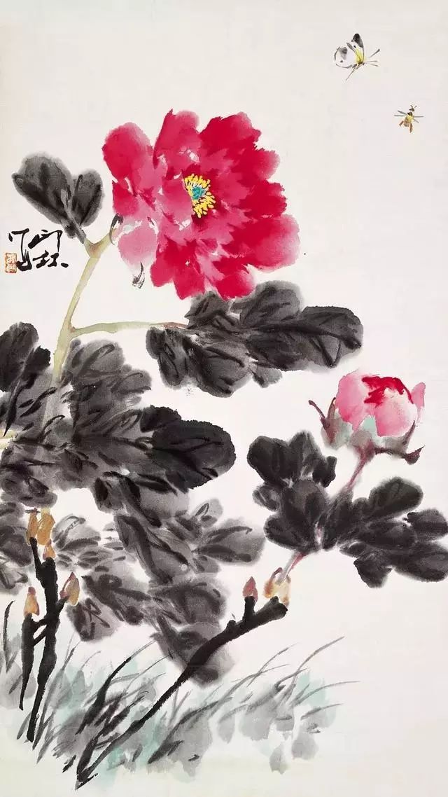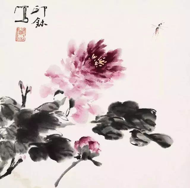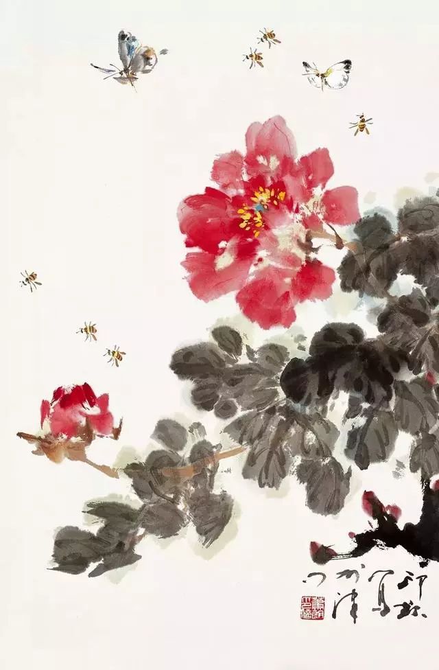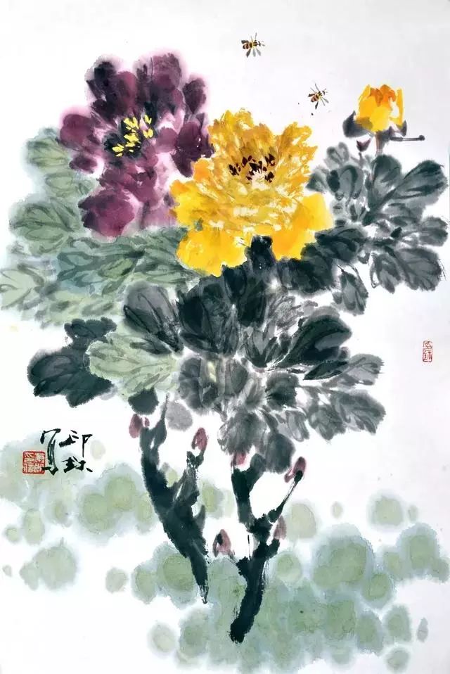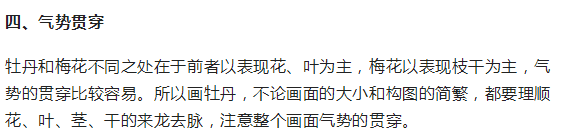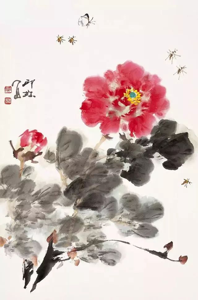 画面只有主体花头,显得孤立单调,必须有体型较小的花苞或初放的花头相衬托。布局上药顾盼呼应,才能体现牡丹的勃勃生机。