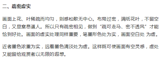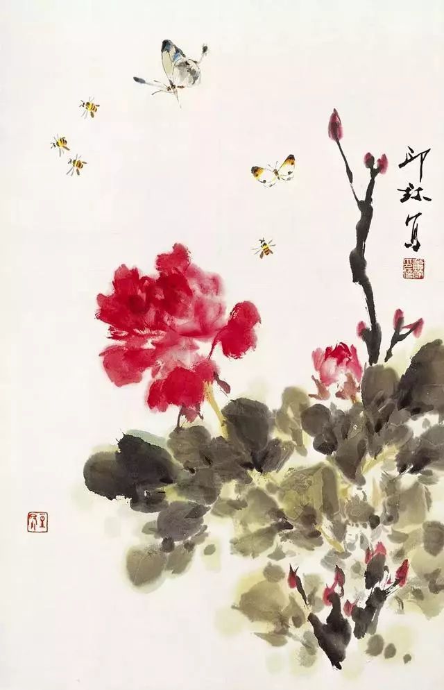 如画两株花茎,应一高一矮,一壮一弱,不要平行等长,才有参差变化。两朵花的构图,花头不要一般大,应一大一小,以盛开花头为主体,另以花苞或初开花朵为陪衬。两花也不要平列或对称,要注意主宾和呼应。