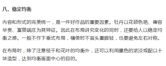 一幅优秀的牡丹画,不但需要有精湛的笔墨表现手法,也需要有高明的布局手段。在中国画论之中,布局被称为“经营位置”,精妙的布局可以使作品富有节奏,艳丽动人。一幅上乘之作,必须是高超的笔墨技巧和优美布局的统一体,两者缺一不可。画牡丹时,布局要注意以下几点。