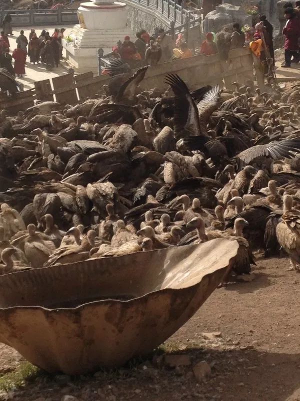 它们从天而降,仿佛严阵以待的卫士,只听从天葬师的指挥,然后煽动翅膀,撕扯,啄食,急急吞咽,瞬间迭成一座活的鸟山,天昏地暗,尘埃滚滚。再次盘旋于空中,那一具具肉体已消逝于它们腹中。