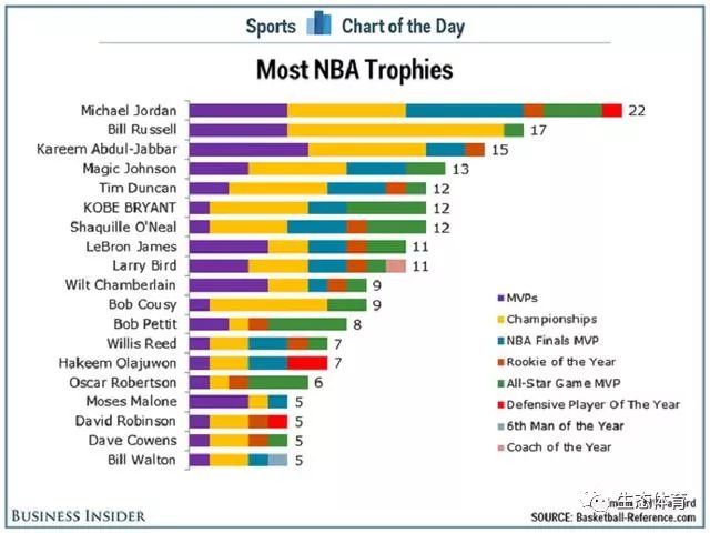 当我们讨论球员的历史地位时,奖杯的数量始终是一个萦绕在脑海中的重要因素,尽管大多数人只会提到NBA总冠军或者MVP,而会忘记其他的荣誉奖项。在NBA的历史上,极少数的球员从进入联盟第一天起就注定是真正的赢家,攀登在通往GOAT的阶梯上,并在历史的纪录簿上留下他们的签名。