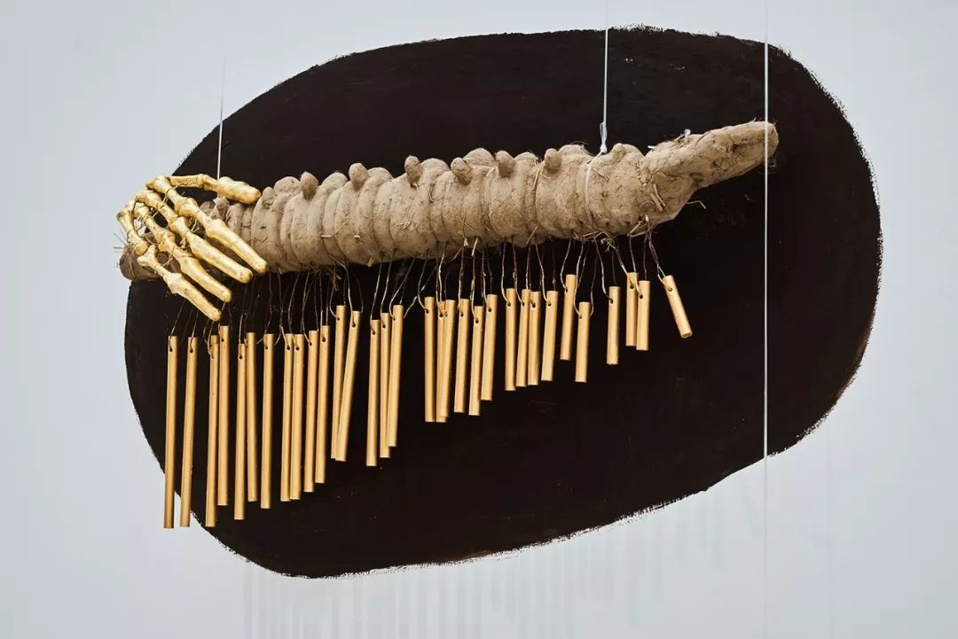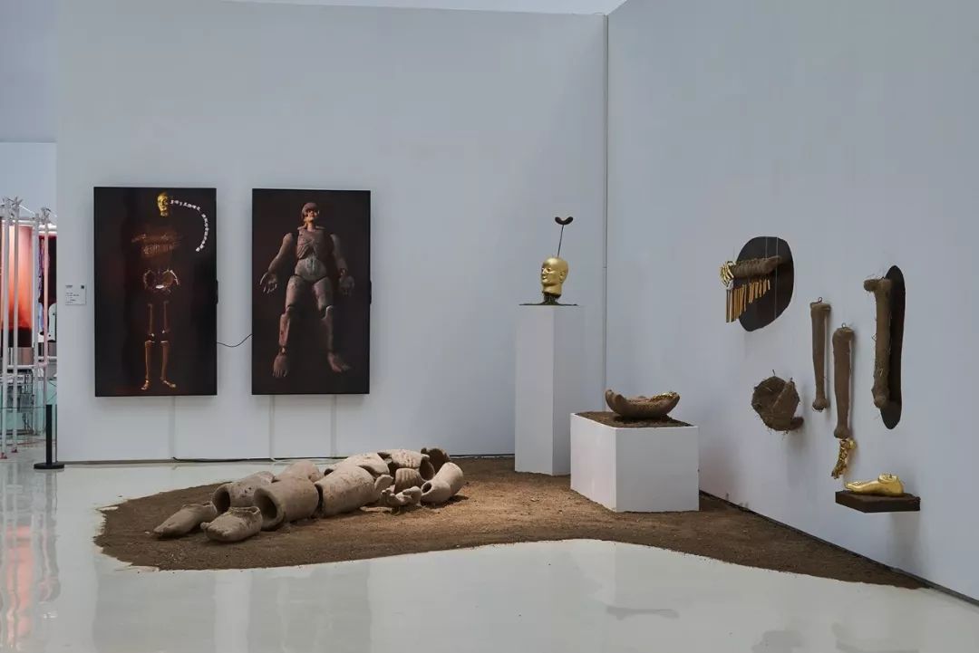 仇越 《泥囊》《金人》《骨琴1》《骨琴2》 泥土、稻草、金箔、金属琴弦、铜管、铜丝