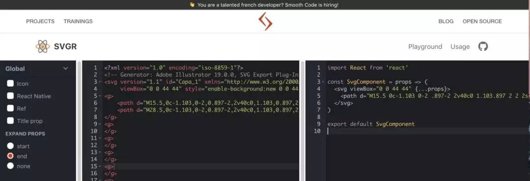 通过 SVGR 在线工具导入 svg 内容生成 React Component 代码。(svgr 也有 cli 等工具)