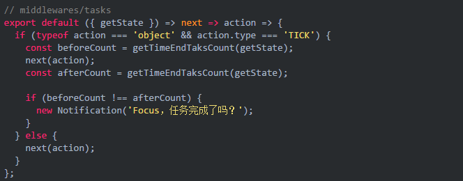 app 在任务时间结束时需要有 Notification,由于的 Tick 设计,判断任务是否完成可以放在 redux middleware 上。