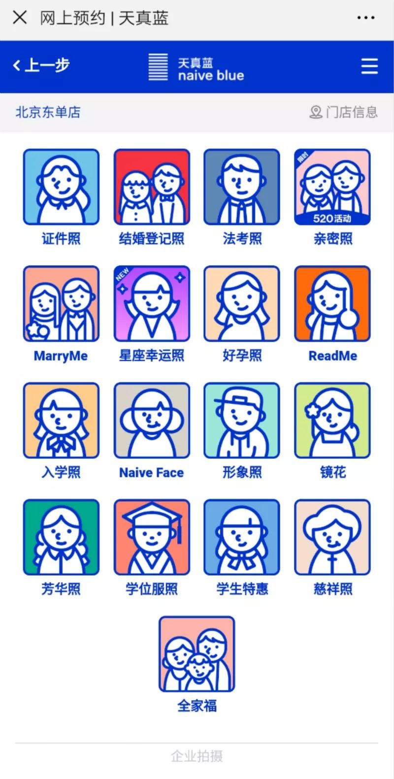 天真蓝开发了一系列非功能性的产品,可以叠加拍摄。比如拍摄结婚证照片的同时,可以加拍一些亲密的合影;拍摄老人肖像照时,加拍家庭写真等等,对顾客来说,不需要额外的妆发造型,也节约了时间。海马体照相馆也成功孵化出了“全年主打”和“限时记忆”两条产品线。全年主打包括证件照、签证照、结婚登记证、职业形象照等多种形象展示型的照片;限时记忆则包括圣诞照、新年照等系列。