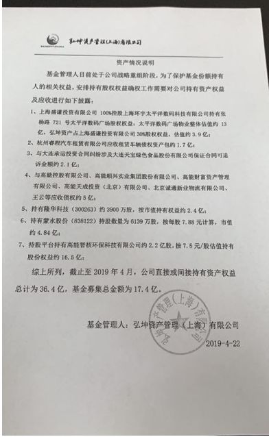 4月22日,在出现兑付问题后,弘坤资产下发了《资产情况说明》称,基金管理人目前处于公司战略重组阶段,为保护基金份额持有人的相关权益,对公司持有资产权益及应收进行披露。
