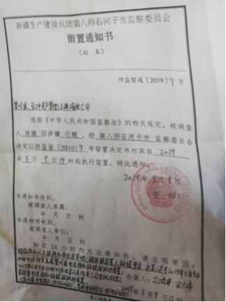 留置通知书显示,根据《中国人民共和国监察法》相关规定,被调查人林辕因涉嫌行贿,经第八师石河子市监察委员会决定以师监留(2019)9号留置决定书对其自2019年5月9日14时起进行执行留置,落款单位为新疆生产建设兵团第八师石河子市监察委员会。