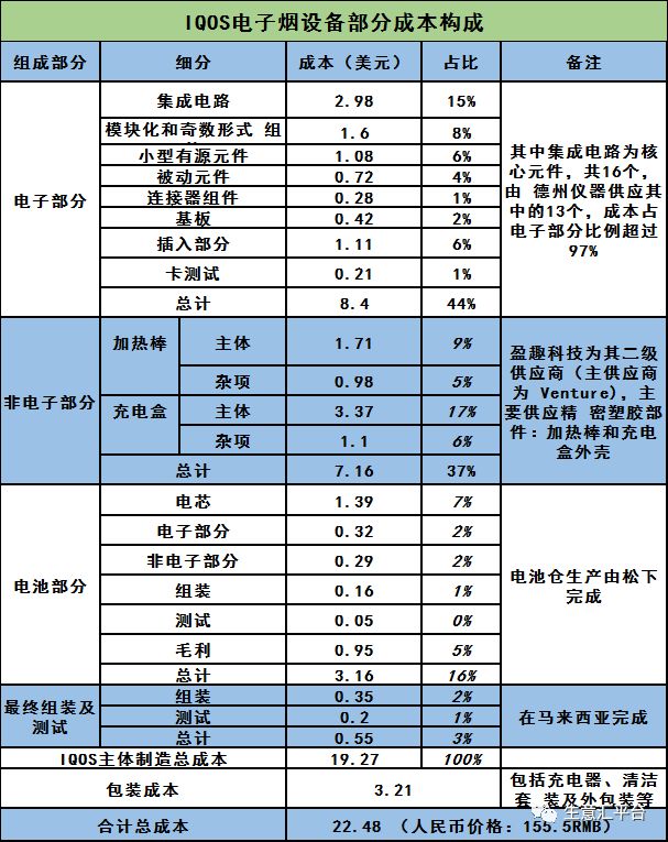 加热不燃烧产品的烟具因为需要对温度进行精准控制,因此控制电路设计比JUUL等扁烟产品要复杂很多。IQOS的主电路板共配备了120个电子元件,主要由TI供应。JUUL没有任何按键设计,通过压力传感器即可感知用户的使用,对电池的要求也没有IQOS高,控制器设计相对比较简单。国内目前也涌现了一批电子烟的方案商,最大的年营收规模在1亿元左右。