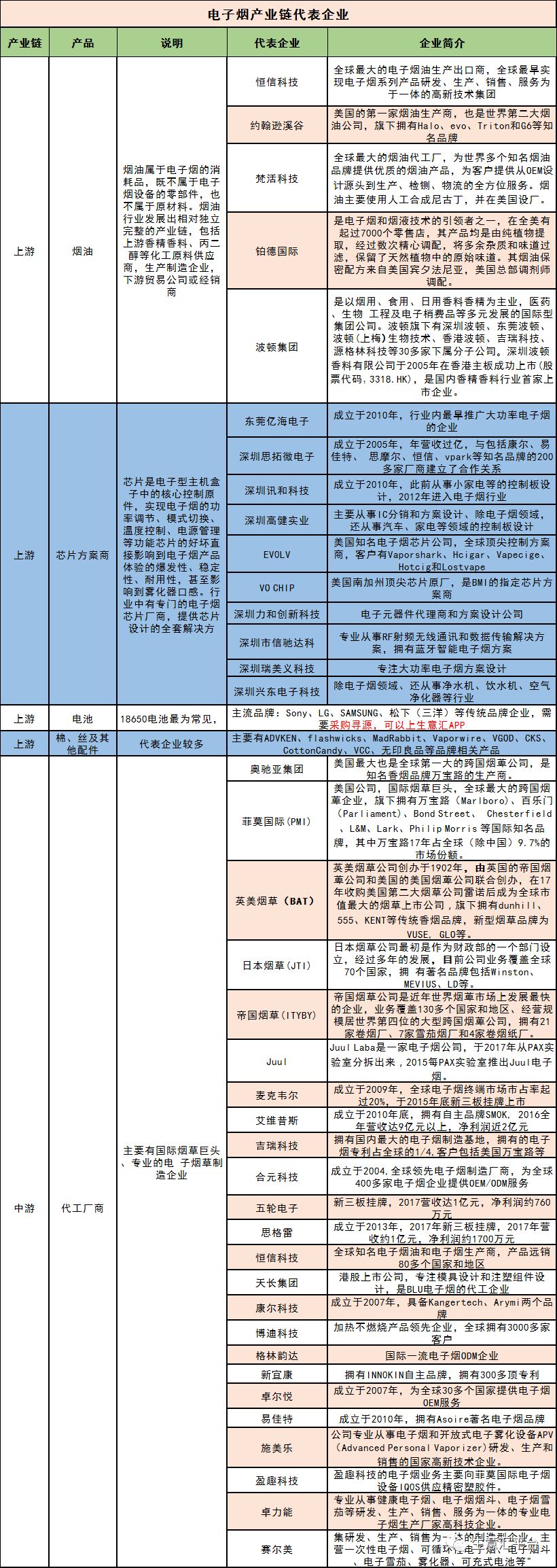上游原材料供应商、电子烟设计制造商、下游销售企业。上游原材料,分为电池原材料供应商(电池、电芯、控制电路)、雾化器原材料供应商(塑料、玻璃、五金、发热电阻)及烟油原材料供应商;