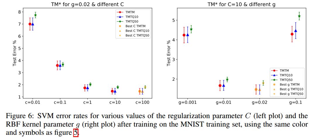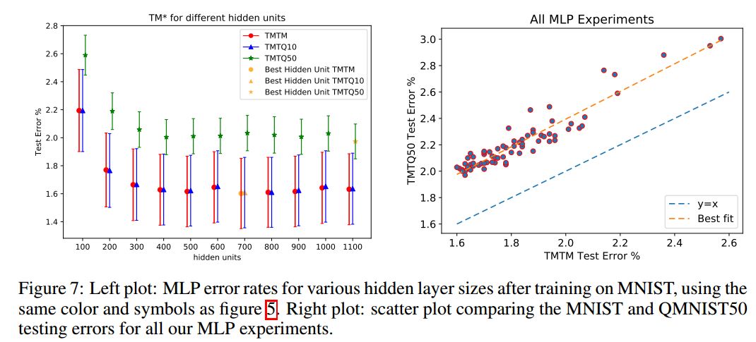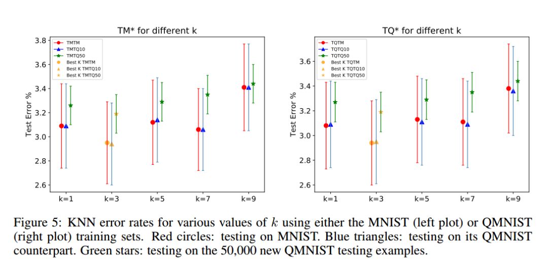 本节是利用未用的50000个样本,来重新审视已经报道过的一些论文结论。Recht等人对CIFAR10和ImageNet有类似的研究。作者使用了三个测试集:MNIST测试集(10000张)、重建的QMNIST测试集(10000张,QMNIST10),以及重建的未用的50000张测试集(QMNIST50)。在MNIST训练集上,类似地,我们使用TQTM、TQTQ10和TQTQ50来表示结果。这些数据都没有使用数据增强。作者使用了KNN、SVM、MLP、Lenet5等方法。