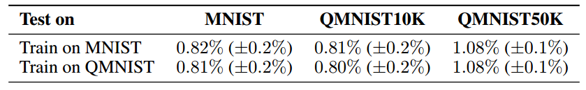 表3:在MNIST和QMNIST训练集上训练LeNet5卷积网络,并在MNIST测试集、QMNIST测试集和QMNIST新部分上进行测试