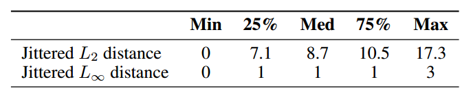 表1:在MNIST和QMNIST之间抖动像素的四分位数,L2距离表示一个像素的差异,L1距离表示像素之间的最大绝对差。