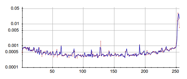 图3:像素直方图对比,红色为MNIST,蓝色为QMNIST。