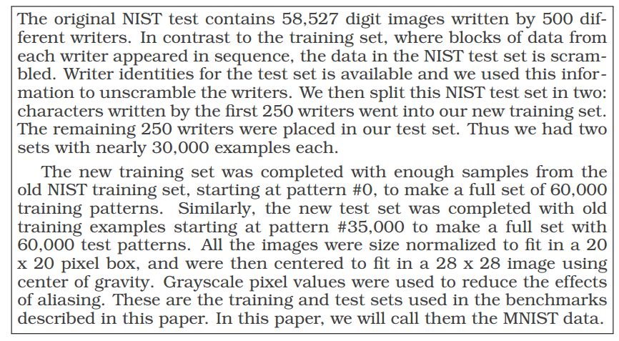 NIST手写字符集的第一部分已经在一年前发布,它是一个由2000名人口普查局员工手写的训练集和500名高中生手写的更具挑战性的测试集。 LeCun、Cortes 和Burges的目标是创建一个具有类似分布的训练集和测试集。这个过程生成了两组60000个样本的数据集,可能是由于当时电脑计算这些数据集的速度非常慢,他们将测试集下采样到仅10000个样本,因此多余的50000样本从未被用于任何的测试。