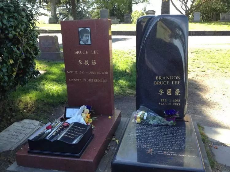 李小龙和儿子李国豪的墓地。李小龙的墓地非常普通,墓碑是一块绛红色大理石,上面有李小龙的照片、英文名字“BruceLee”以及中文原名李振藩。