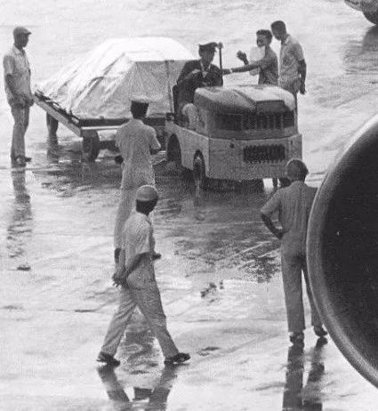 李小龙的灵柩即将被装上飞机。关于李小龙的死因,有这样一种说法,“死于急性脑水肿,原因是对止痛药中的某些成份产生了过敏反应。”