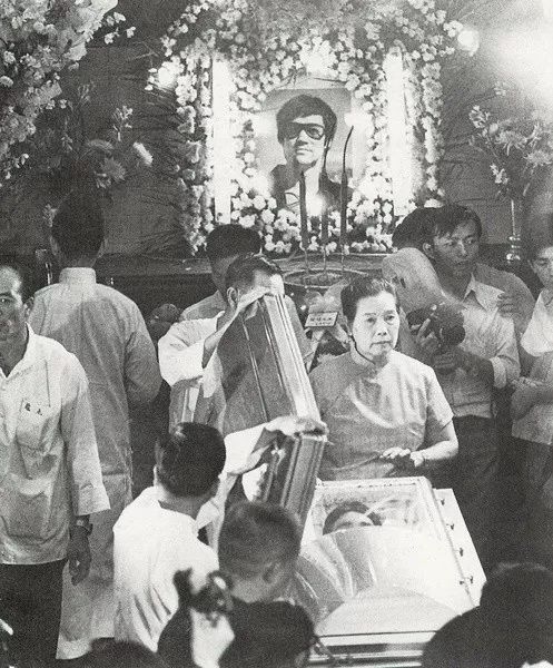 李小龙去世后,葬礼分为两场:香港和美国西雅图。其中香港的葬礼规模盛大,可谓万人空巷。图:李小龙灵堂里摆放的遗照,他自信地笑着,嘴角略带着一丝傲色。