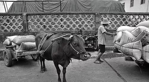 由于时间紧、人多,每次交公粮都像是“打仗”,农民的架子车、拖拉机、牛车、驴车各种车辆,混杂在一起排着队,往往会把粮食所门前的一条路排满。