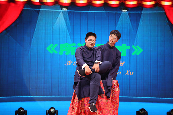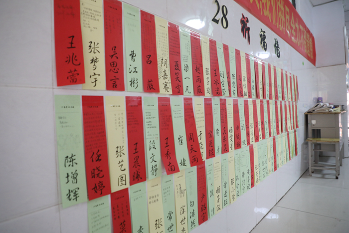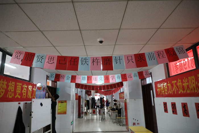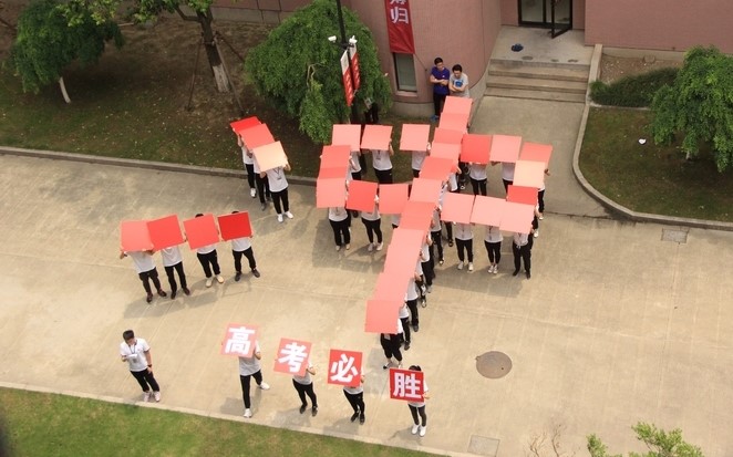 高一高二同学们在楼前空地上用红色纸板迅速组成一个大大的“冲”字造型。学弟学妹们为学长们送上了呐喊祝福:“滴水穿石战高考,百炼成钢铸辉煌!力争上游,龙腾虎跃朝气蓬勃;壮志凌云,你追我赶势夺第一!看今年硕果飘香迎佳绩,待明朝笑傲高考创辉煌!栉风沐雨,愿学长奔赴似锦前程;秣马厉兵,待前辈谱写华彩人生!高三的学长学姐们,冲冲冲!加油加油加油!”口号声响彻楼宇。与此同时,在高三教学楼的对面挂起了巨幅的对联,上联:乘骑骥,六龙回日曙光初,十年寒窗深知大任降;下联:踏长歌,九天揽月飞鹤行,三载春楸誓拔头筹归。横批:金榜题名!