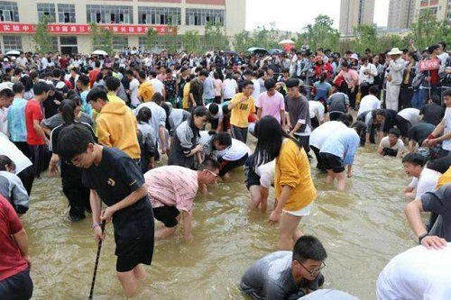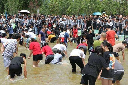 该校每年的5月25日左右,会在校园内举行一场徒手抓鱼大赛。全校共有23个班级1400余名高三学生和家长共同参与,每次抓上来约500斤左右鲫鱼。最后鲫鱼被送到食堂,师生及家长以鱼为宴共进晚餐。捉鱼减压还有一个重要的寓意,那就是――鲤鱼跃龙门。