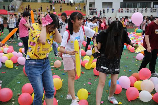 该校每年5月28日左右,在学校操场,2万多只气球把整个操场点缀得五彩斑斓。随着老师一声令下,2000多名考生冲向了操场,开始了疯狂踩气球。考生在气球铺成的海洋里快乐奔跑、放声呼喊,伴随着呐喊声、欢笑声,伴随着“砰、砰、砰”气球爆裂声, 2万只气球,不到5分钟时间内便被学生们全部踩爆。