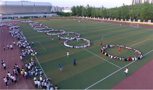 该校在每年的5月20日左右,在操场上组织开展高考减压拓展活动。活动一般有三项:看图片猜数字,“十二生肖”和“动力圈”活动。“动力圈”活动,四条大绳盘成四个动力圈,全级800多名学生双手紧握大绳,肩并肩席地而坐,按照教练的要求摇动大绳。