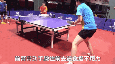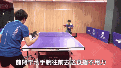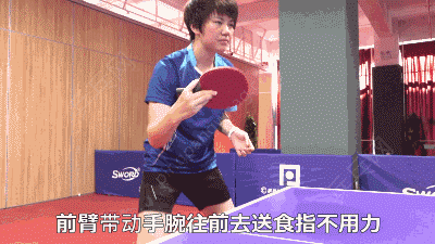 还是前臂带动手腕往前去送,一定是前臂带动手腕,食指也是不用力的,和正手握拍的动作是一样的,两边的转换是不需要任何手指的动作的,然后你拿好拍子可以了。