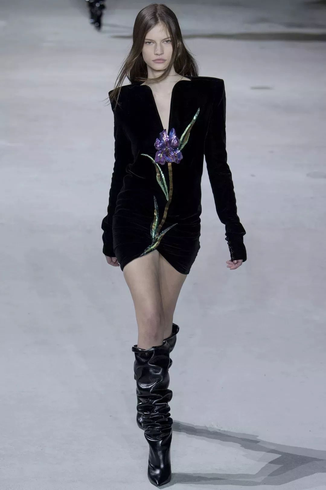 面对“花”这个主题,时尚设计师都会用雪纺、欧根纱这种柔软、轻盈、半透明的面料来突出它的飘逸感。但Anthony Vaccarello却打破陈规,采用皮革来展现花的韧性。