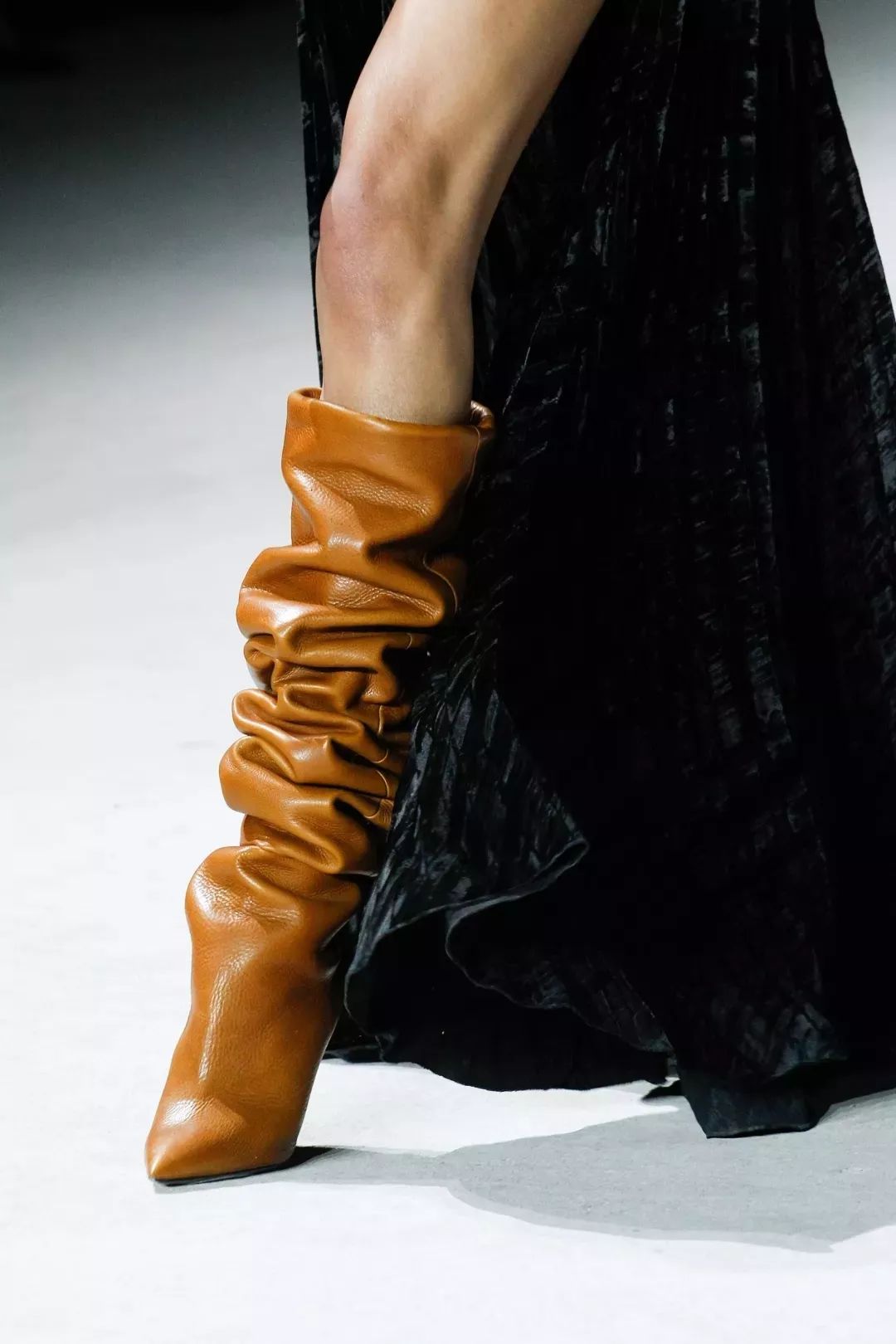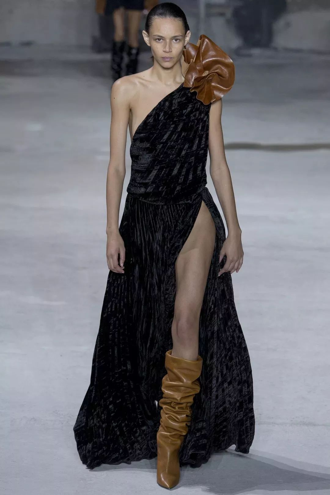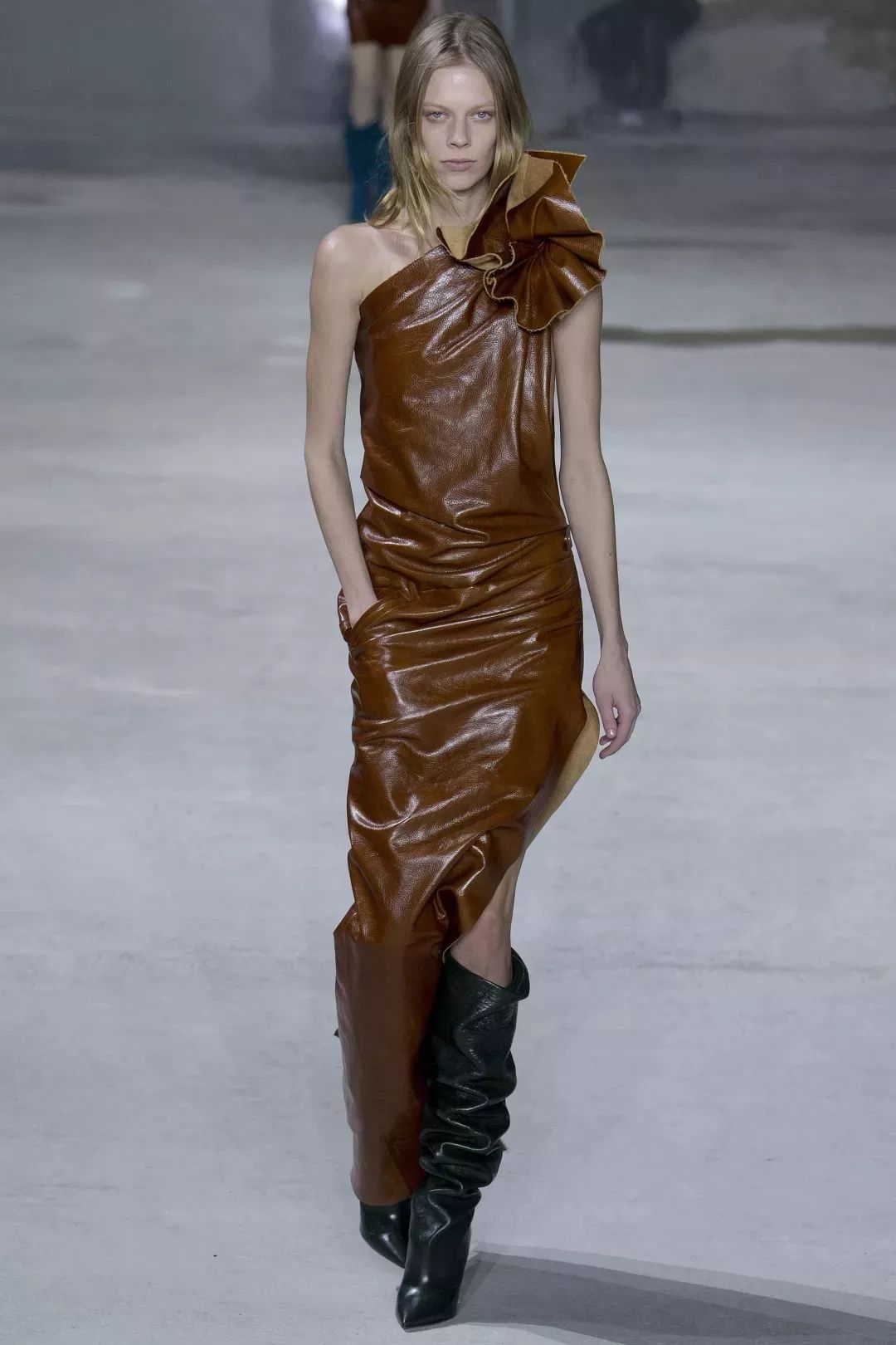 Anthony Vaccarello是一位敢于在面料选择上冒险的天才设计师。皮革虽然让长裙失去了其原本该有的垂坠感,但却赋予了它雕塑般的立体感与层次感。皮革长裙古怪、僵硬但却与众不同,让人无法挪开视线。