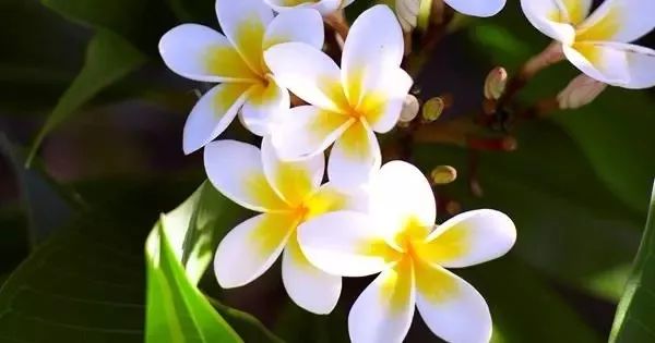 鸡蛋花的花色,看起来有点像鸡蛋的颜色,比如常见的橘黄色,当然也有粉色和白色的花色,花朵看起来像鸟儿美丽的羽毛,还会散发迷人的香味,看着特别清新。