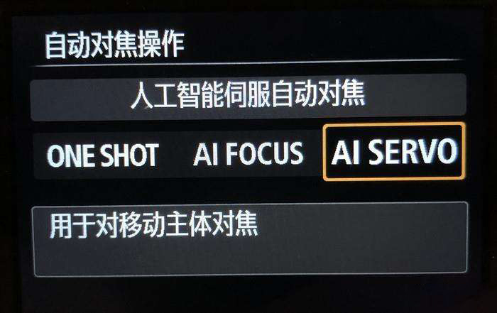 人工智能伺服自动对焦(AI SERVO) :在这种方式下,如果静止主体开始移动,相机会自动把自动对焦方式从单次自动对焦切换到人工智能伺服自动对焦。适用于拍摄可预测运动规律的事物;不适用:球类运动 ,宠物摄影 以及乱跑的儿童。使用时注意旋转相机保证对焦点始终在主角上