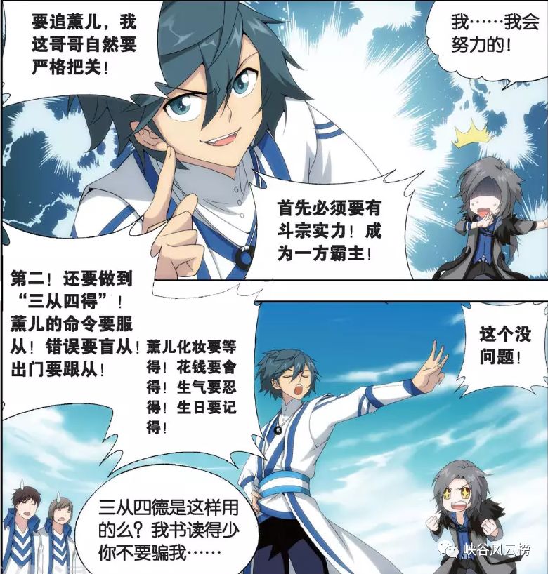 林修崖不知道,但是我们大家都知道,这萧薰儿就是萧炎的未来老婆啊。竟然还在萧炎的面前说要追萧薰儿,自然萧炎不会让林修崖好过的。这不,萧炎就开始给林修崖教导三从四德了。第一个要求就是要有斗宗实力,成为一方霸主,第二就是要三从四德,萧薰儿的化妆要等得,花钱要舍得,生气要忍得,生日要记得!