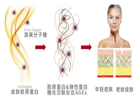 简单一句话概括便是,当皮肤中的胶原蛋白与游离分子糖结合,使得糖化的胶原蛋白和弹力蛋白失去它们的生理功能和对皮肤组织的支持作用和弹性,这一整个过程被称之为糖化交联反应 AGEs。 AGEs即是导致皮肤老化和视觉衰老的根本原因,而阻断游离分子糖交联皮肤蛋白就是“抗糖化”。
