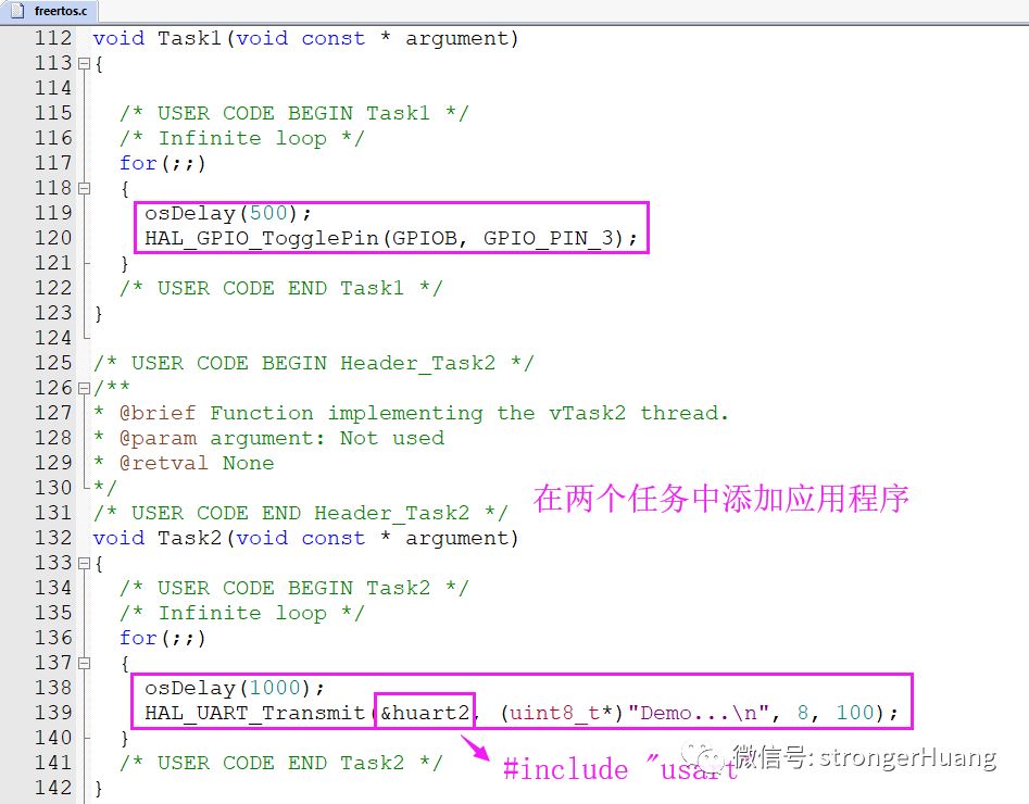 这里创建两个FreeRTOS任务:Task1和Task2。