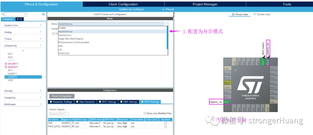 这里配置成异步模式之后,引脚自动配置(我的开发板RX引脚不是默认,则需要自己配置)。
