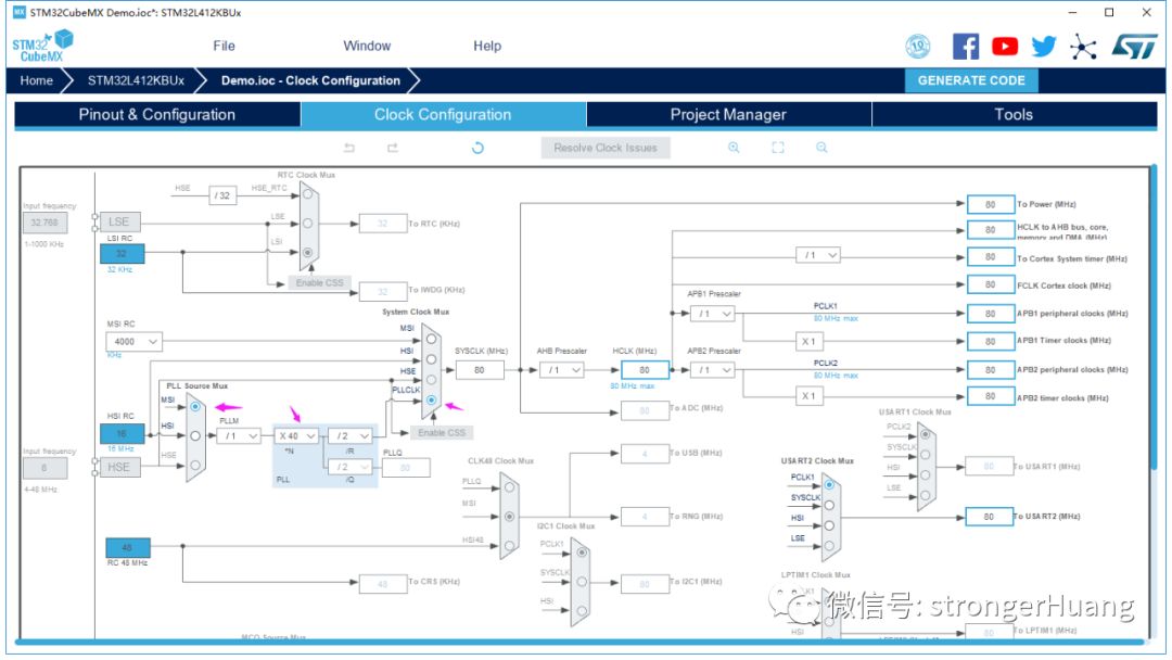 这里选择MSI作为时钟源,进行倍频,是系统时钟达到80M。