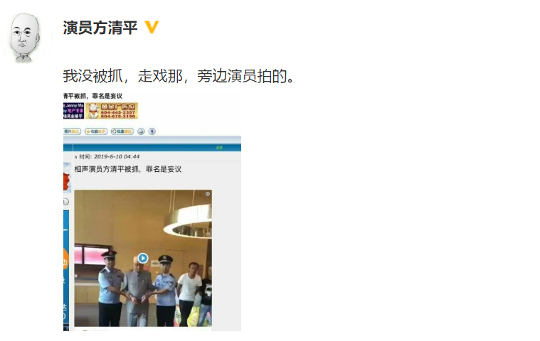 6月11日,著名相声演员方清平亲自澄清网上关于他被逮捕的消息,表示:“我没被抓,走戏那,旁边演员拍的”,原来是个大乌龙,引起网友热议。