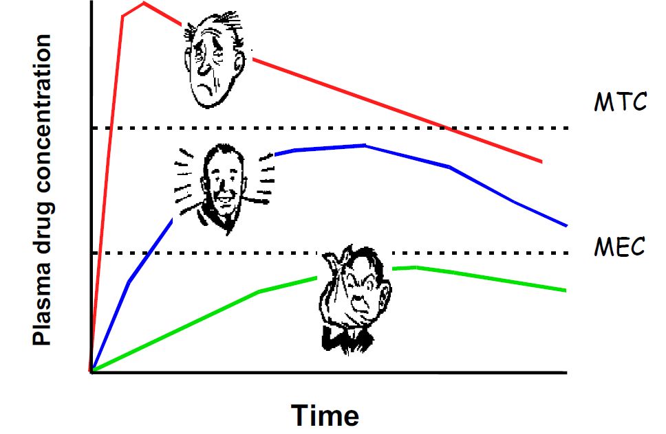 当然,DDI最终的结果还是反映在药物疗效和毒性方面的变化。通常情况下,使用单药治疗会使该药物的血药浓度处于合适的治疗窗内,而发生DDI时,则会出现两种不利于单药发挥疗效的情况:即DDI造成药效下降,低于治疗窗导致原剂量失效;或是药效增强,超出治疗窗导致明显毒副作用。