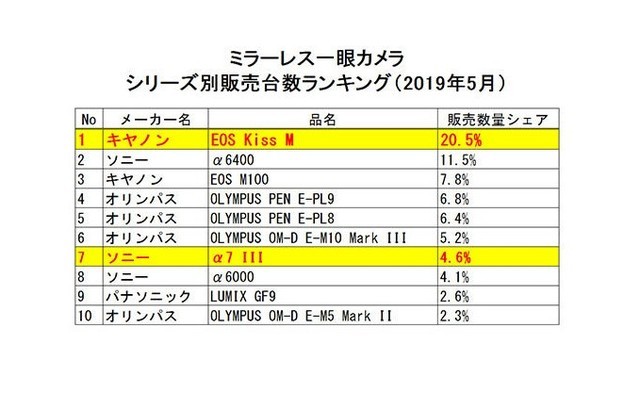 可以看到,在5月份日本市场无反相机销量前十名中,佳能虽然仅有两款产品上榜,但是分别排名是第一名和第三名,占据了接近30%的销量份额,优势巨大。索尼有三款产品上榜,占据了接近20%的销量份额,不过值得一提的是索尼A7 III是唯一一款上榜的全画幅微单相机,排名第七,但是因此可以给索尼带来巨大的利润。