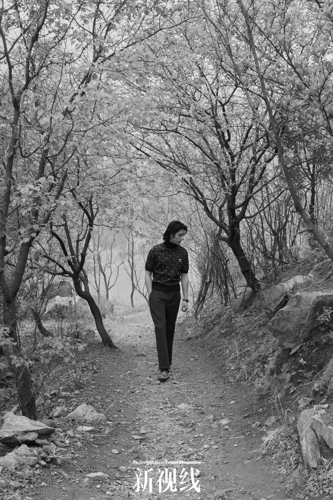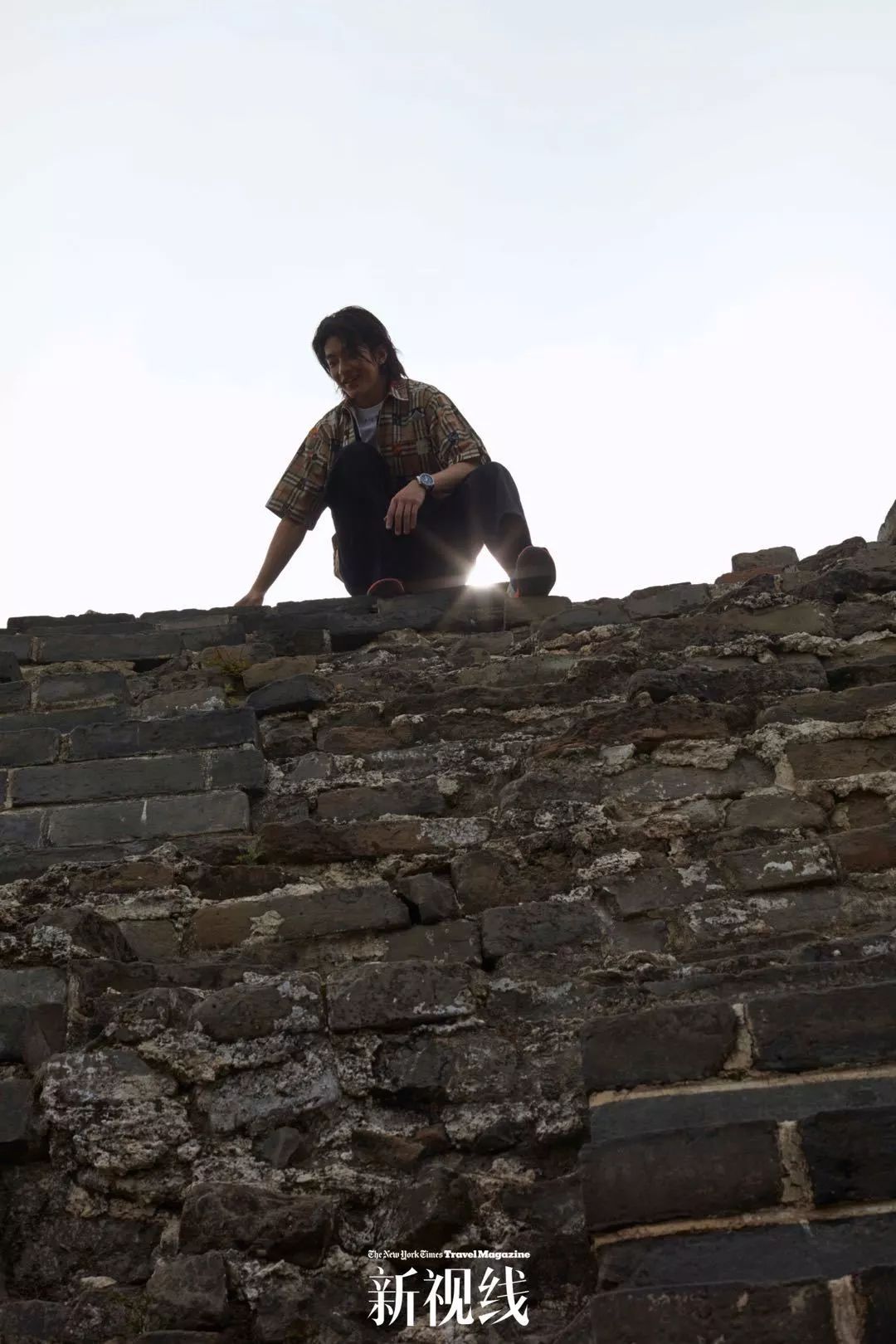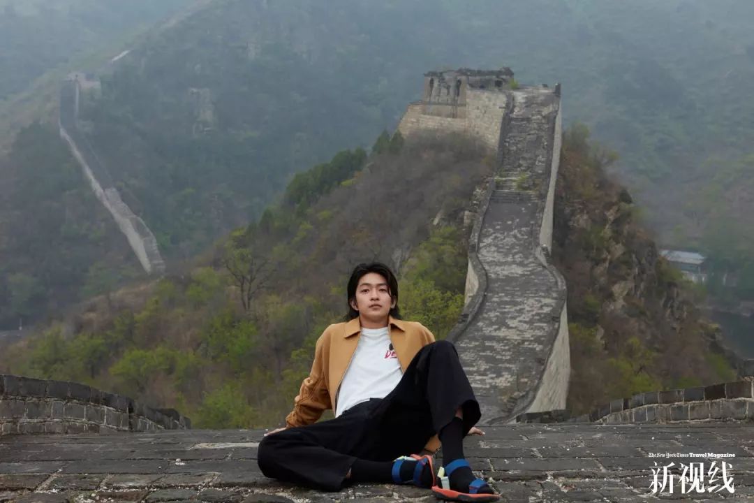 屈楚萧在黄花城长城附近的野长城上。卡其色夹克、黑色阔腿长裤 均为 McQ,白色内搭 DEUS EX MACHINA from i.t,撞色凉鞋 Camper。