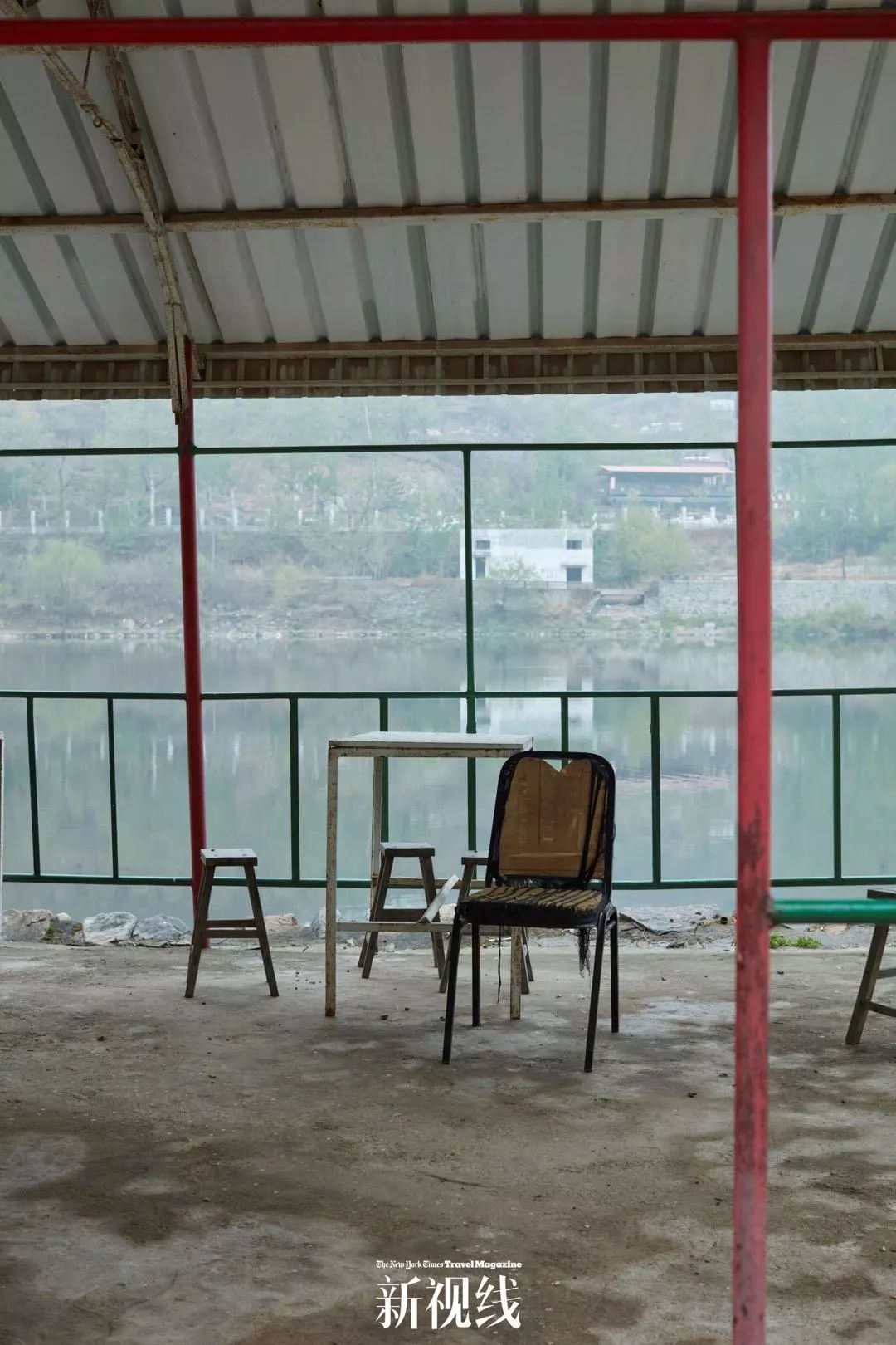 野长城脚下水库边的游客休息区在工作日时空无一人。