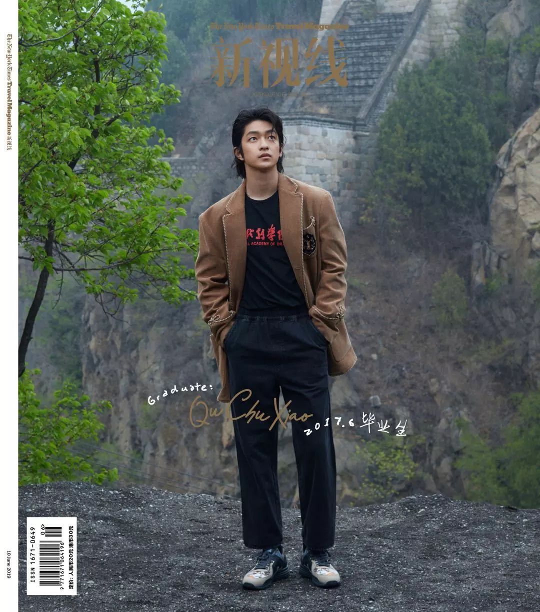 《屈楚萧,青出于蓝的路》封面由Wanglei and Jiangkun拍摄,棕色夹克 Gucci,黑色直筒牛仔裤 Common Gender,运动鞋 Camper。