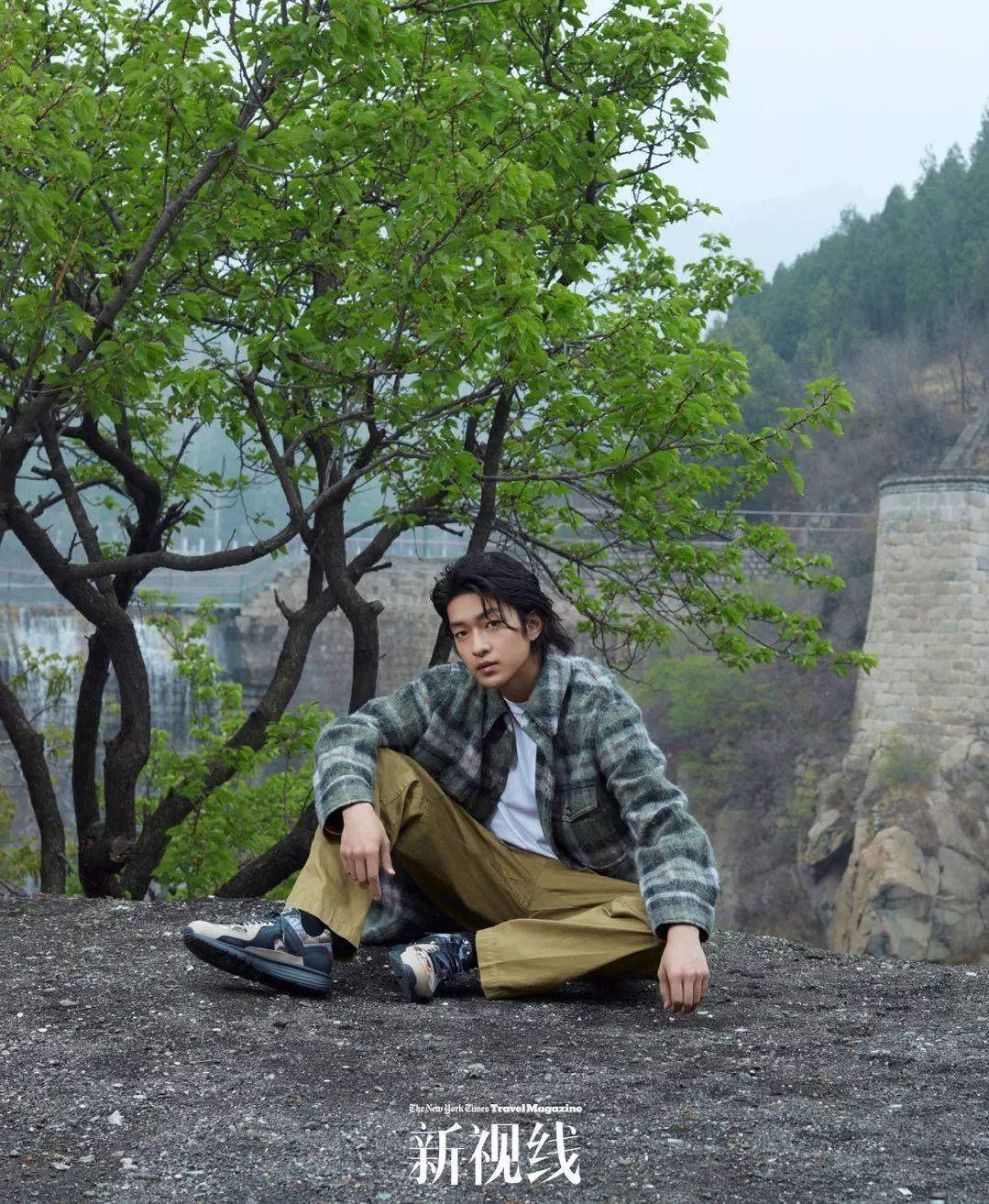 屈楚萧在黄花城长城附近的野长城外的农家乐岸边。绿色格纹上衣 Isabel Marant,白色短袖 Prada,军绿色休闲裤 Givenchy,运动鞋 Camper。