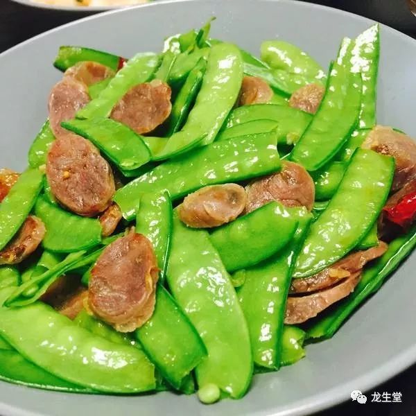 做法:荷兰豆洗净焯水,在冷水中浸泡一下,控干水分;香肠切片,蒜切片,葱切片;锅中放油,放上葱花,放入荷兰豆煸炒片刻;放上香肠、蒜片、盐、鸡精出锅即可。