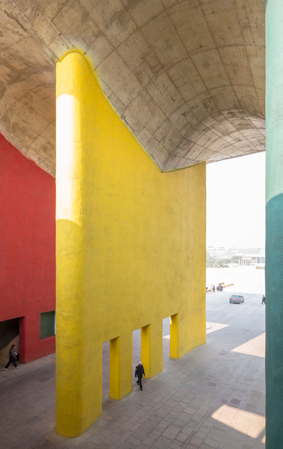 由11个连续的拱壳组成的屋顶,长100多米,深达1.4米的混凝土顶棚几乎全面覆盖了这座建筑的立面,纷繁的红色、黄色与绿色让最高法院成了政治中心建筑群中最亮眼的存在。