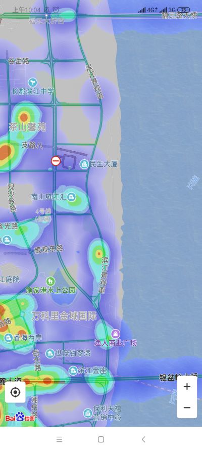 滨江新城白天热力图颜色较亮,人口密集,多集中在楷林国际、渔人商业广场和各银行。